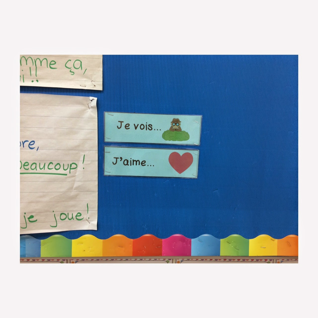 My grade 2s have also been playing colour "bang", but they have to use the word in a sentence. I am trying to break them of the habit of starting their sentences with "je vois", so we will slowly be adding in different options for sentence starters on our bulletin board.